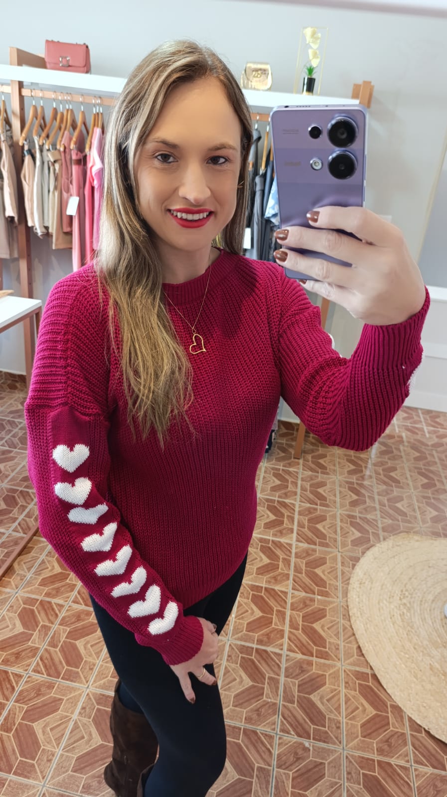 Modelagem confortável e lavemente ajustada ao corpo.O Grande charme esta nos detalhes da manga,corações brancos dispostos ao longo de toda a extensão da manga ,conferindo um toque romantico e delicado.