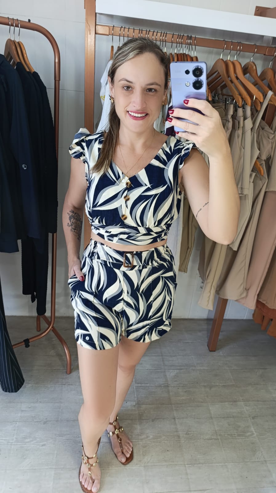 Conjunto composto por um cropped e um shorts de cintura alta, ambos confeccionados em tecido leve, perfeito para os dias quentes.